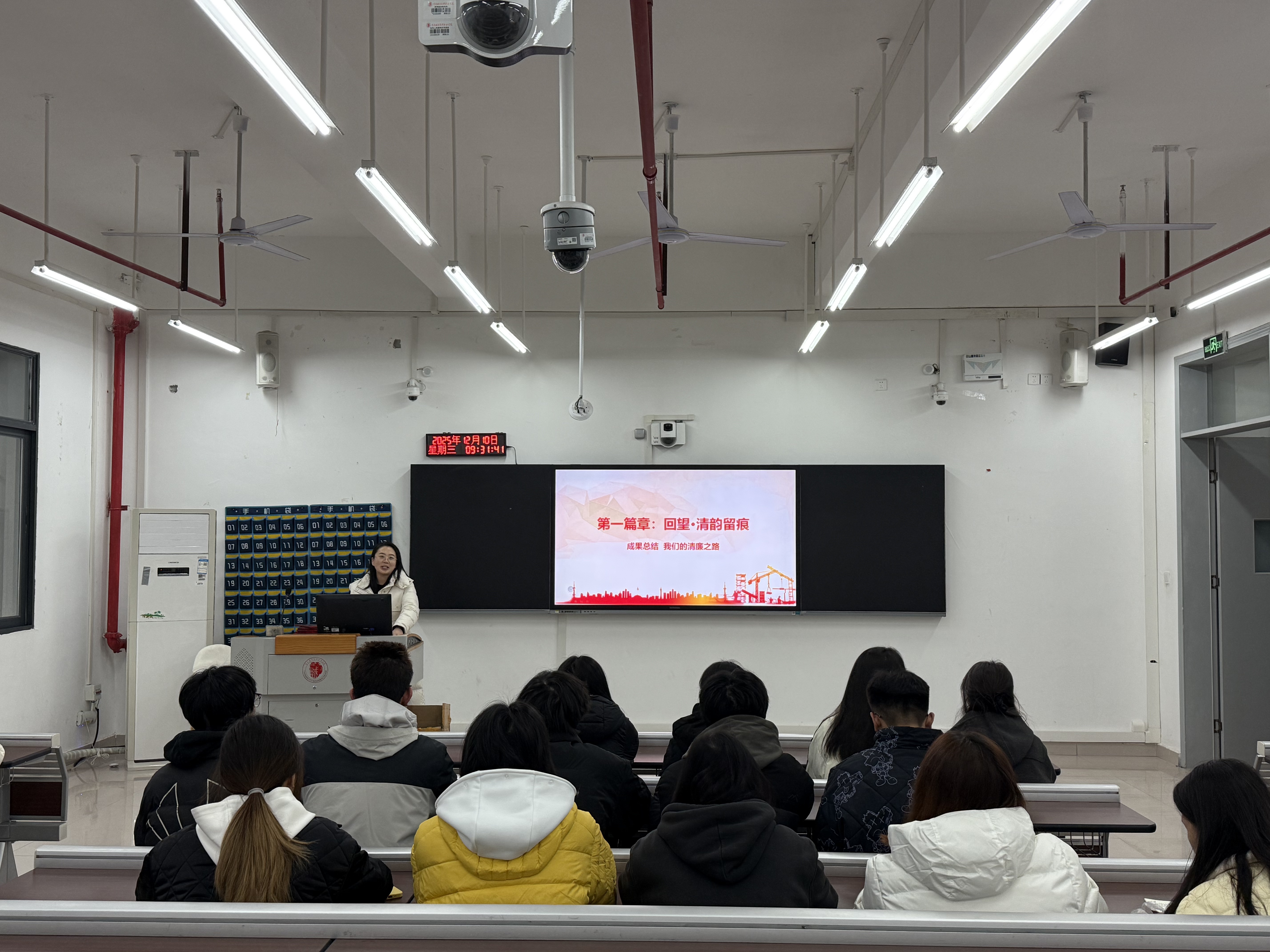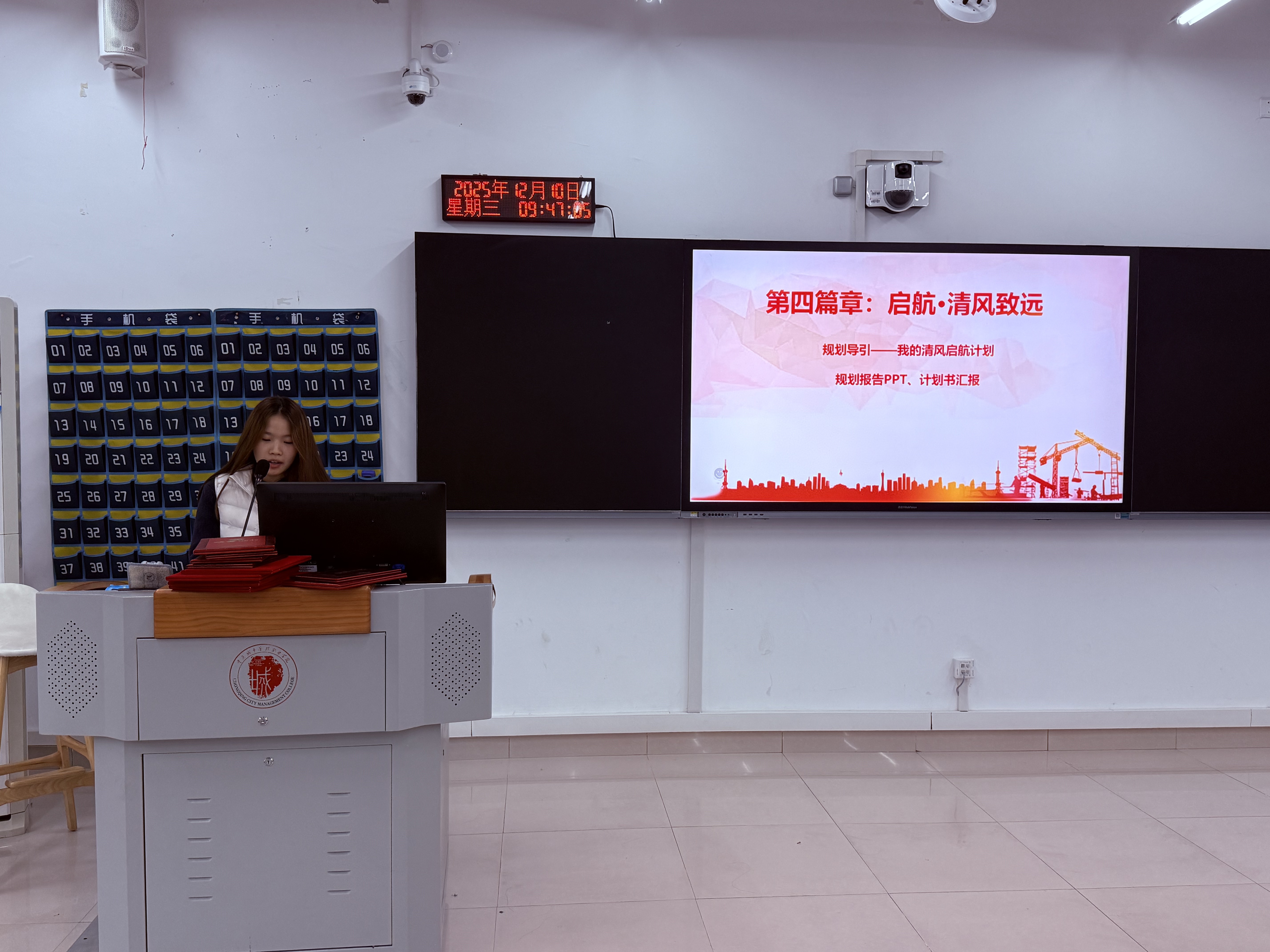 活动在庄严而温馨的氛围中拉开序幕。在第一篇章“回望·清韵留痕”中,辅导员老师通过图文并茂的PPT,系统总结了清廉班级创建的全过程,包括主题学习、实践活动及班级风貌的积极转变,生动展现了同学们在清廉意识与行为养成上的成长轨迹。