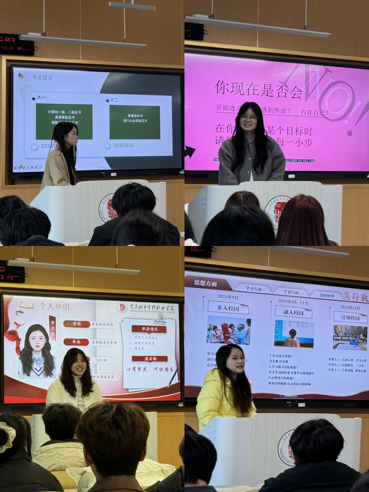 分享会上,贺婷婷以“学习·成长·选择”为主题,结合自身学习成长经历,分享了专升本学习经验。她强调了夯实专业基础、考取行业相关证书,以及专升本对个人发展的重要性,鼓励同学们尽早做好规划,在实践中积累经验。贺佳和申兰欣以“在竞赛与实习中探索未来”为题,分享了她们参与学科竞赛、企业实习和准备升学考试的经历。她们详细介绍了如何平衡课程学习与社会实践之间的关系,并通过具体案例说明了竞赛和实习对个人综合能力的提升作用,为同学们提供了可借鉴的成长路径。王凤和冉晓丹则围绕“适应、规划与突破——我的大二成长记”展开分享,结合自身从迷茫到清晰的学业规划过程,讲述了如何通过优化课程学习方法、提升课堂效率、加强课后复习与拓展来夯实专业基础。她们鼓励同学们重视平时积累、积极参与课堂互动、主动向教师请教,逐步构建完整的专业知识体系。在互动环节,各位分享人就同学们提出的“如何选择第一份实习”“跨年级如何有效学习”“学业压力调节方法”等问题进行了细致解答,现场气氛热烈、交流深入。
