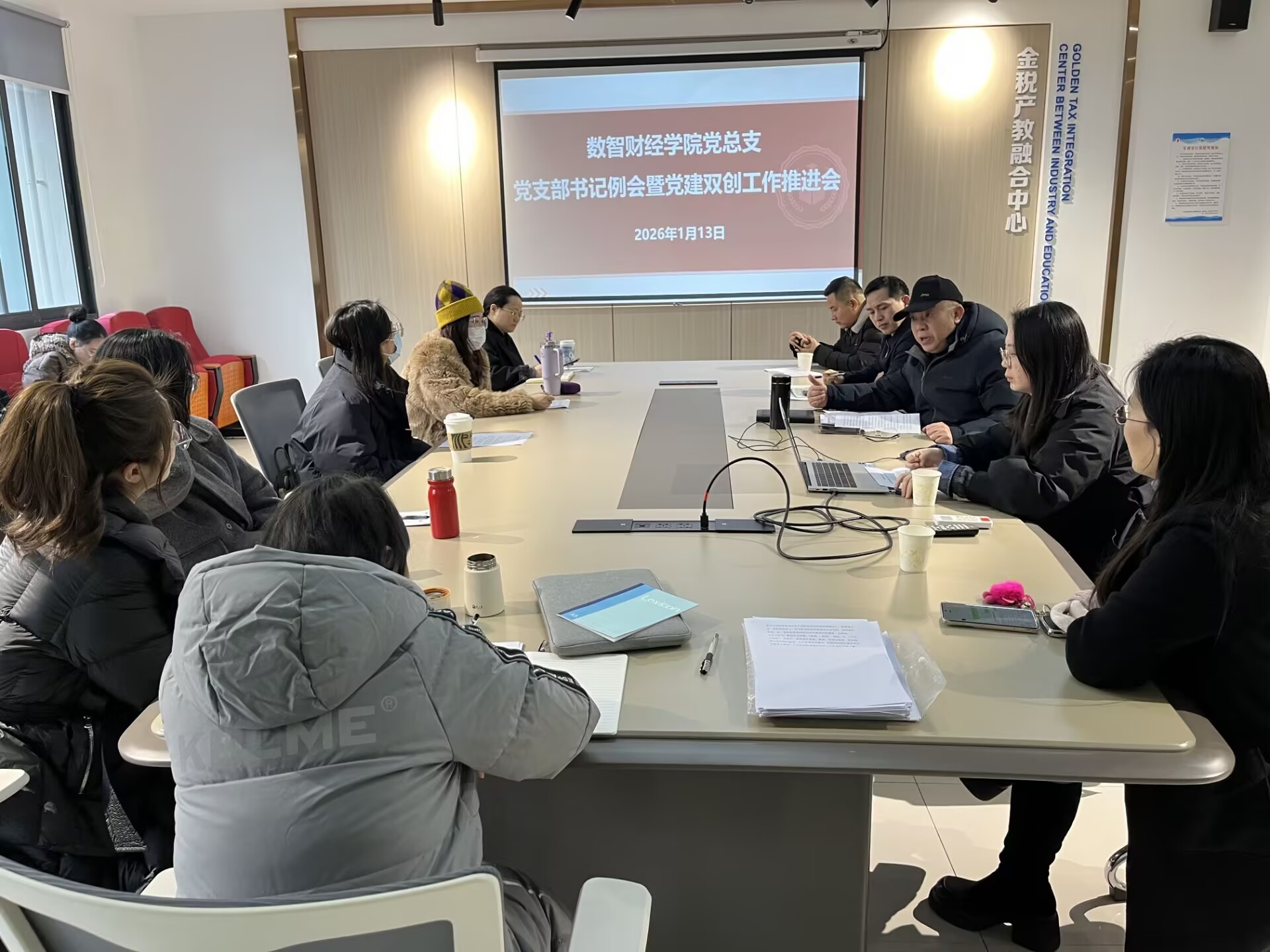 为深入贯彻落实党的二十届四中全会精神,进一步提升党建工作质量,推动党建与业务深度融合,探索党建“双创”新路径,1月13日,我院党总支在致用楼C205组织召开党支部书记例会暨党建“双创”工作推进会。学院党总支委员、全体党支部书记、支部委员及党员代表参加会议。会议特邀我校文化传播专业群党支部书记张东教授作专题辅导。