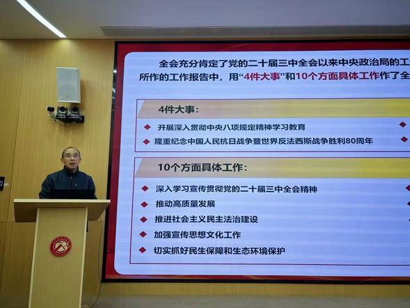 在中国式现代化纵深推进的关键节点,为推动党的二十届四中全会精神与学校发展规划深度融合,将“数字中国”建设战略转化为数智育人实效,12月23日下午,重庆城市管理职业学院党委委员、副院长瞿中在马克思主义学院学术报告厅为大数据与信息产业学院全体教师作《深入学习贯彻党的二十届四中全会精神》专题宣讲。此次宣讲由大数据与信息产业学院党总支书记董勇主持。