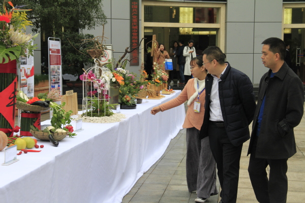 在上午的会议报到现场,特邀我校工程管理学院举办“心怀匠心静待花开”花之语插花艺术展,以展现我校园林艺术专业的课程思政成果。师生们精心设计制作了《韵香清远》《丰收-何园育知秋,桃李满天下》《哺育》等16件作品,其中《韵香清远》《丰收-何园育知秋,桃李满天下》刚刚获得“首届长江上游城市花卉艺术博览会”金奖和银奖。与会来宾纷纷在展台驻足参观拍照,工程管理学院教师陈丽花和学生志愿者主动为与会代表解读每一件作品。这次插花艺术展将中国传统插花艺术与社会主义核心价值观有机结合,充分展现了我校园林技术专业的专业魅力和师生风貌,得到了与会领导和代表的一致好评。