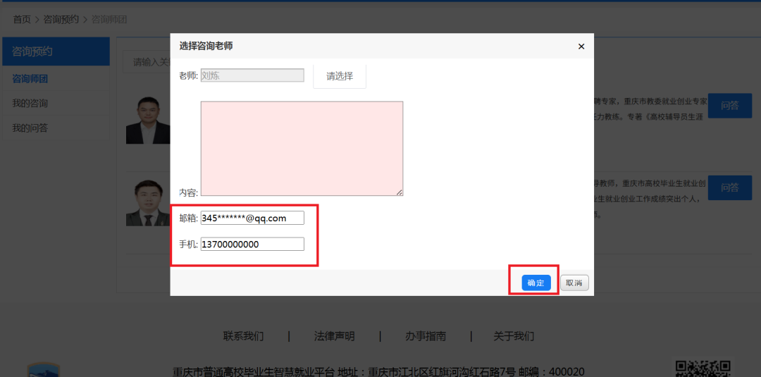 确认个人信息(邮箱、电话),填写咨询内容,点击 “确认” 提交。