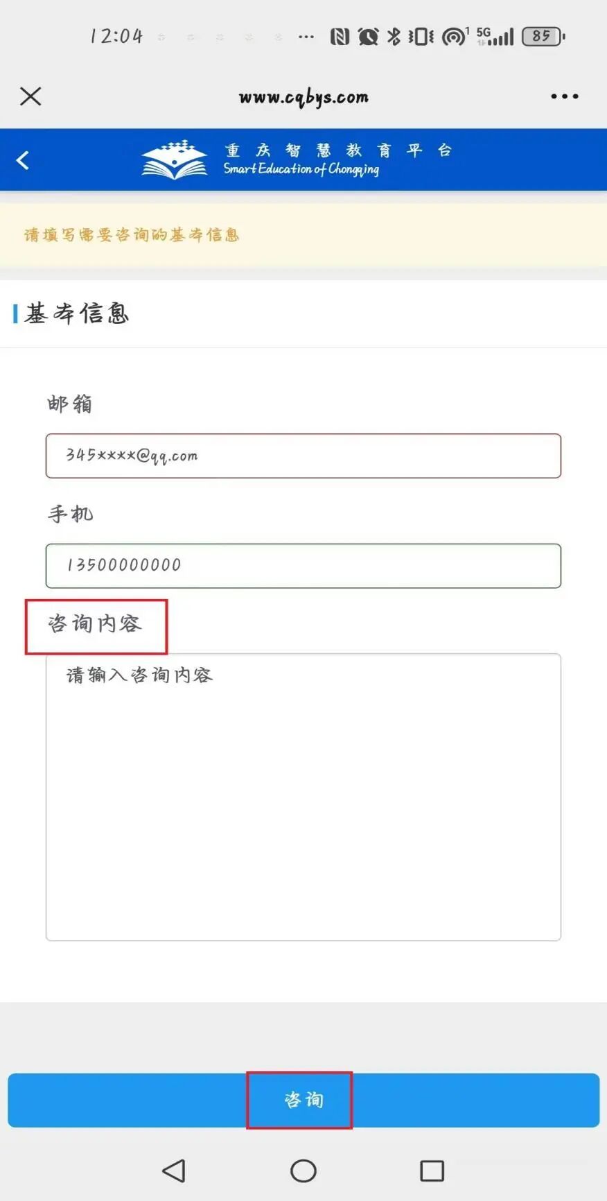 核对并确认个人基本信息(邮箱、联系电话),详细描述你想要咨询的问题,最后点击 “咨询” 提交。