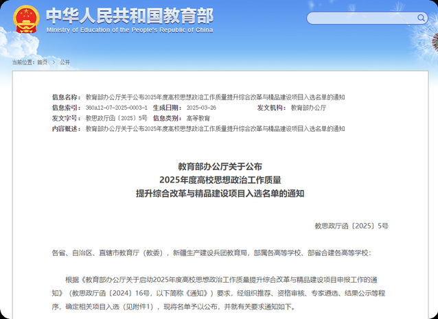 据悉,教育部自2018年正式启动高校思想政治工作质量提升综合改革与精品建设项目的遴选工作。作为全国高校思想政治工作领域的标志性评选,该项目着眼“时代新人铸魂工程”提质升级,通过选树培育一批可示范、可引领、可辐射、可推广、可持续的思想政治工作品牌项目,着力推进各高校建设高质量思想政治工作体系、构筑立德树人新格局,为实施新时代立德树人工程提供有力支撑。