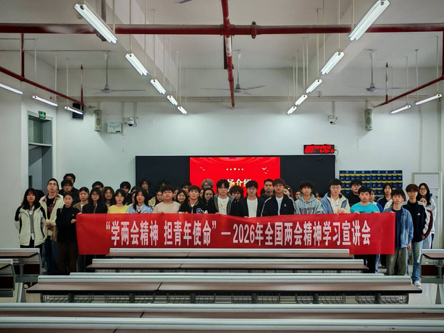 为深入学习贯彻2026年全国两会精神,引领广大青年学生坚定理想信念,将个人成长融入强国建设、民族复兴的伟大征程,2026年4月7日,习近平新时代中国特色社会主义思想学习会于大学城校区致用楼C106开展以“学两会精神 担青年使命”为主题的2026年全国两会精神学习宣讲会。全校各院系学生代表齐聚一堂,共学两会精神,共担时代使命。