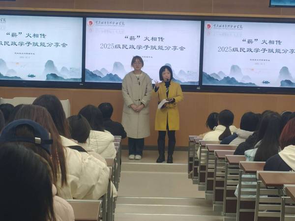 2025年12月2日,民政专业老师于荣昌校区厚德楼612教室举办专场赋能分享会,2025级民政服务与管理专业全体大一学生参会,大二学生蔡佳茵、程心、游渝鹭主持活动。破冰环节,同学们组建五人小队参与“你画我猜”接力比拼,快速消融陌生感;“师长引航”中,专业带头人易丹老师围绕“求学初心”“大学规划”“成长路径”分享,李长洪、韩玲老师通过视频寄语,勉励学子成为有温度、有担当的民政人。“远方的灯塔”环节,优秀校友张婧雯、王雨婷分别分享学业深造与基层服务经验,蔡佳茵、程心分享大学生人力资源知识技能竞赛备赛心得,游渝鹭详解社区应急大赛赛项要点与备赛策略,以朋辈力量为同学们指引方向。“梦想启航”环节,同学们通过“学习通”作答学业规划问题,在深度思考中梳理成长思路。随后,易丹老师为每位学生送上镜子,寄寓“以镜自省、明心笃行”的成长期许,同学们还上台用一句凝练有力的话语公开大学奋斗目标,展现出昂扬向上的青春风貌。