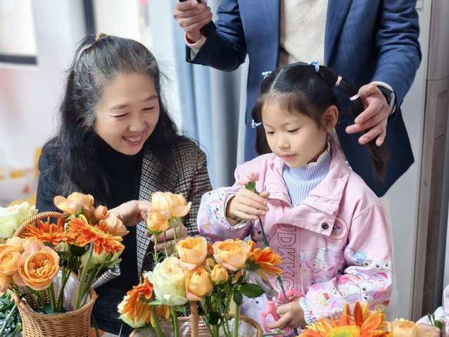 插花环节是活动重头戏。花艺师何老师根据老年群体审美与实操能力,从花材识别、修剪技巧到色彩搭配,耐心讲解并一对一指导。老人们专注实践,现场花香四溢、欢声笑语。创作中,何老师融入关系调适分享,结合插花哲思,引导老人思考人际相处智慧,学习积极倾听、真诚赞美等沟通技巧。