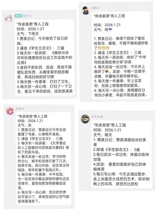 本次活动紧扣“听、拍、做、读、服、写”六大板块,设计“听一个家族小故事、拍一张有温度的照片、做一次生活小观察、读一点有启发的书、完成一次微服务、写一封给三月自己的信”实践任务,引导学子在多维体验中深化专业认知、厚植为民情怀。从家族故事里读懂“家国一体”的深沉联结,从镜头定格中捕捉基层治理的民生烟火,从生活观察中感知社会发展的脉搏与机遇,从经典阅读中汲取服务民生的智慧力量,更走进社区、躬身服务,以“微服务”传递温暖,以书信寄语锚定成长方向,让个人成长与基层发展同频共振 。