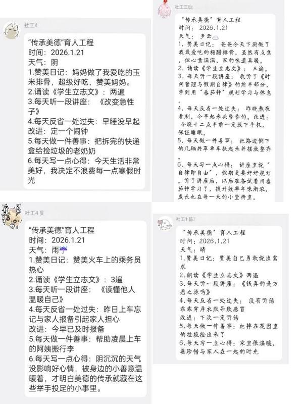 同步开展的温润心田“六个一”每日打卡活动,成为学子成长的“加油站”。大家坚持记录志愿服务点滴、生活观察感悟与成长心得,日复一日的打卡不仅锤炼了自我管理能力,更积淀了扎根基层的底气与定力——每一次记录都是自律的见证,每一份坚持都为“久久为功”写下青春注脚 。