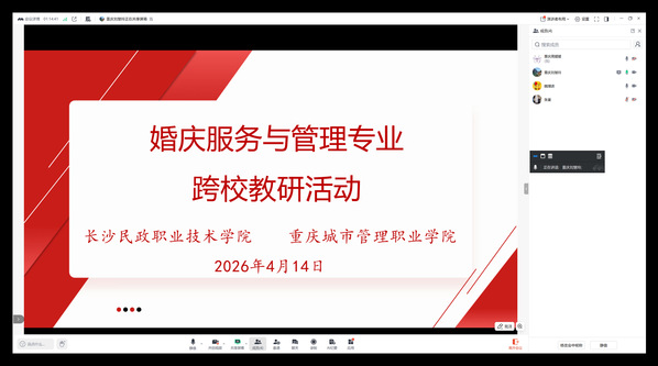 为促进不同学校间的专业交流与合作,4月14日,我院婚庆服务与管理专业与长沙民政职业技术学院婚庆服务与管理专业线上开展跨校教研活动,活动由我院婚庆服务与管理专业教研室主任刘慧玲主持。