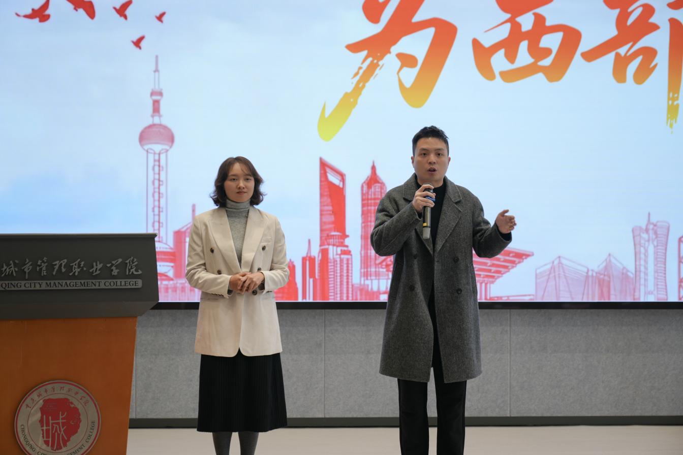 主题分享环节中,两位全国优秀西部计划志愿者深情讲述了他们的基层服务经历。荣昌区直升镇志愿者冉彦玲以“挥洒在乡村的志愿青春,值!”为题,分享了其探索直播助农、助力乡村振兴的坚守与收获;潼南区群力镇志愿者张莲则回顾了自己从学生志愿者成长为西部计划一员的心路历程,分享了投身基层治理与公益服务的实践感悟。她们的真实经历,生动诠释了新时代青年的责任担当,引发了现场师生的强烈共鸣。