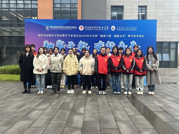 11月22日,重庆市高职高专外语教学专业委员会2025年年会暨“融赛于教、赋能未来”教学改革论坛在重宾楼成功举办。在商务英语专业党支部的积极组织和引领下,支部书记杜媛媛、专业带头人杨明亚、教研室主任彭诗璇率队,携支部学生预备党员、入党积极分子一行全程参与学习交流。支部另选派6名学生入党积极分子担任会议志愿者,以热情专业的服务保障了会议部分环节的顺利运行,展现了商务英语专业学子良好的精神风貌与担当意识。