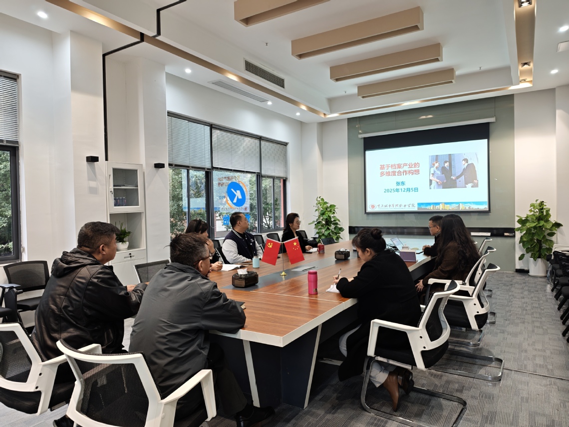 重庆世纪科怡科技股份有限公司董事长马正宏、总经理杨学森、副总经理熊春梅等出席会议。张东教授主要介绍了现代学徒制合作办学的思路、档案数字化加工职业技能等级证书培训鉴定等5个方面的校企合作事项,公司马正宏董事长充分肯定了校企合作的价值并就一些具体做法提出了要求和建议、熊春梅副总经理谈到了具体合作细节的落实。会议讨论出了下一步工作的进度和成果要求,进一步深化了现代文秘专业的校企合作。