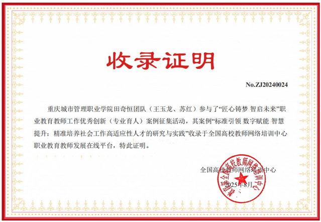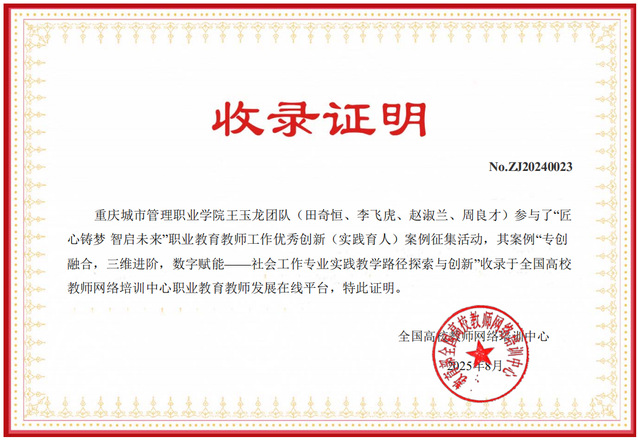 近日,教育部全国高校教师网络培训中心公布了“匠心筑梦 智启未来”职业教育教师工作优秀创新案例认证结果,我校田奇恒团队提交的案例《标准引领 数字赋能 智慧提升:精准培养社会工作高适应性人才的研究与实践》和王玉龙团队提交的《专创融合 三维进阶 数字赋能:社会工作专业实践教学路径探索与创新》收录于全国高校教师网络培训中心职业教育教师发展在线平台。