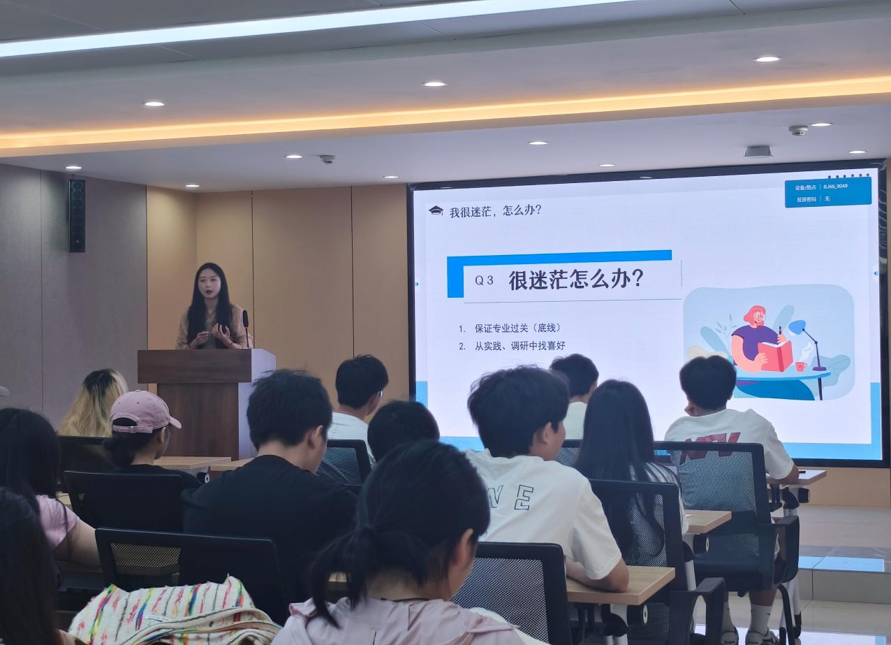 陈思琪结合自己的工作经验,主要围绕“我很迷茫,怎么办?”、“就业或升本,怎么选?”、“如何正面自己的选择”等同学们普遍关心的主题,结合丰富的案例,向同学们分别阐述就业和专升本各自的优势,并为现场的学生们提供了诸多宝贵的建议和指导。