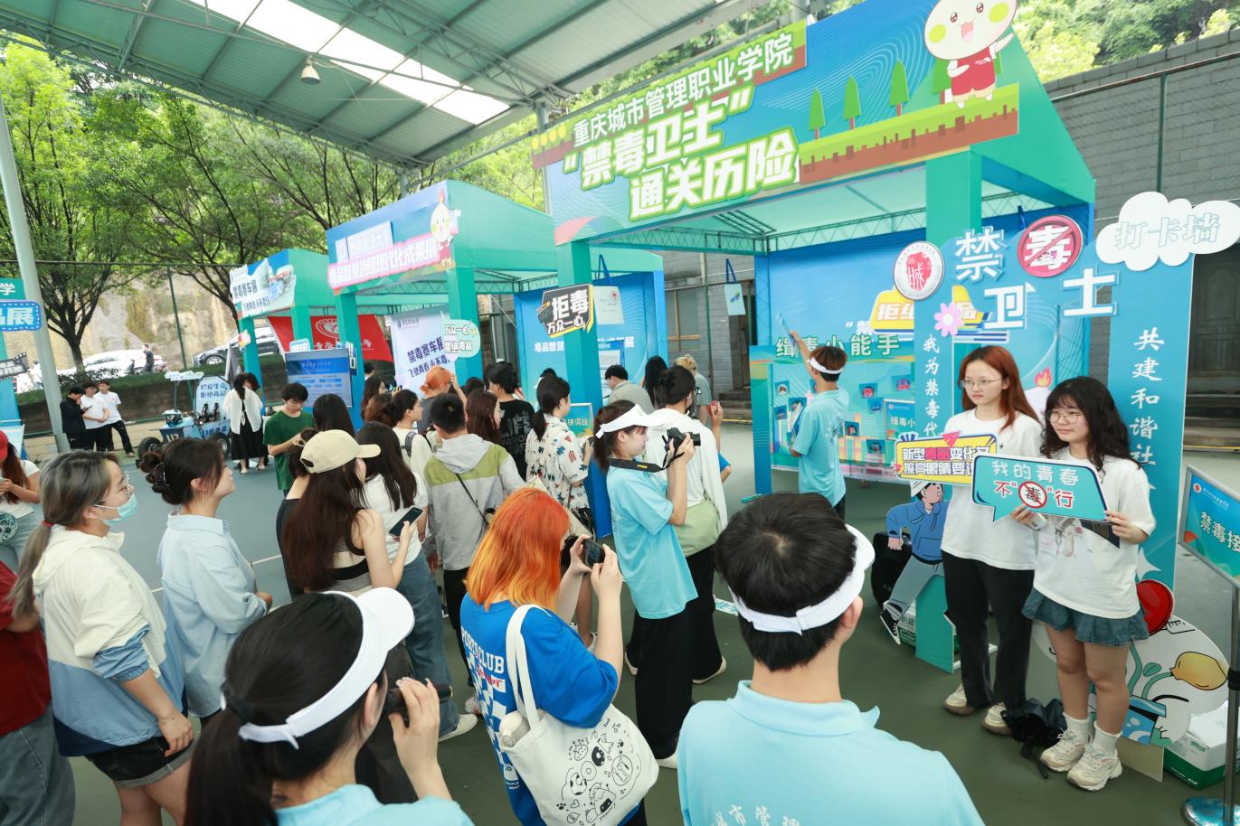 同时,在禁毒文化主题文创展的宣传活动现场,我校学生组织的“禁毒卫士”通关历险活动,通过以寓促教方式来深入宣传禁毒知识“圈粉”无数。分别设置了投球识毒品、毒品拼词战、缉毒小能手、禁毒先锋、接力等通关项目,向参展者提供了一个沉浸式禁毒成果体验环境。期间,与在校大学生充分互动,不仅赢得了火爆的人气,更体现出了高校大学生群体对禁毒工作的深刻理解和坚定支持。未来,我校还将继续投身禁毒宣传教育,秉承创新精神,积极探索实践,激发广大青年学生积极参与校园禁毒活动的动力,为构建风清气正的社会环境贡献青春力量。