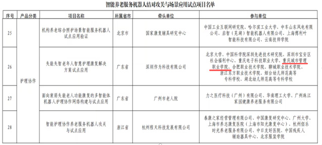 据工业和信息化部官网消息,近日,工业和信息化部、民政部联合公布《智能养老服务机器人结对攻关与场景应用试点项目名单》,共计32个项目入围,包括“情绪陪护”“康复支持”“生活照料”等10个类别。我校与深圳作为科技有限公司等单位联合申报的《失能失智老年人智慧护理康复解决方案试点应用》项目入选护理协作类项目名单。