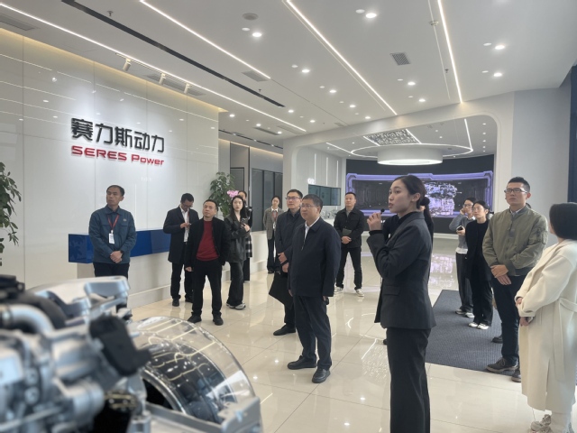 在赛力斯动力相关负责人的陪同下,邓明国一行先后参观了企业展厅、核心研发中心及全流程智能制造生产线,沉浸式感受企业在智能制造领域的技术实力与创新活力。展厅内,邓明国一行针对新能源动力系统、智能电控核心部件等关键展区,详细询问技术研发突破点与产业应用前景,并对赛力斯动力深耕智能制造领域的技术沉淀、前瞻布局及创新成果给予高度赞誉。
