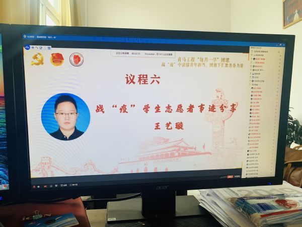 3月15日,习近平总书记给北京大学援鄂医疗队全体“90后”党员回信,向他们及奋战在一线的广大疫情防控人员致以亲切问候,并寄语广大青年不惧风雨、勇挑重担,“让青春在党和人民最需要的地方绽放绚丽之花”。3月30日,我校组织校级“青马工程”学员以线上专题团课方式,邀请学校民政与社会治理学院党总支书记陶军屹老师、党总支专职组织员李国英老师线上授课,师生志愿者代表以及全体二级学院团总支书记参会、全校各级学生会干部、战疫志愿者代表参与学习。会议由校团委书记张毓威老师主持。