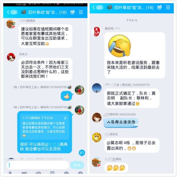 志愿服务行动队成立当日,便通过QQ群进行了60分钟的远程培训以及互动答疑,并推荐产生了队长、副队长,2月27日,正式启动志愿服务。志愿者们热情满满,积极参与,仅服务开展的第一天,就累计服务27人次,其中包括上门送快递服务12次,主动电话问候15户居家隔离人员、独居且行动不便的老人,关心对方是否因疫情影响遇到生活困难,是否需要提供帮助,并给对方留下了便民服务卡信息。为了及时、有针对性的为居家隔离人员提供生活保障服务,行动队还建了“逸雅苑小区返渝居家隔离人员”QQ群,居家隔离人员可通过此群得到及时的服务。