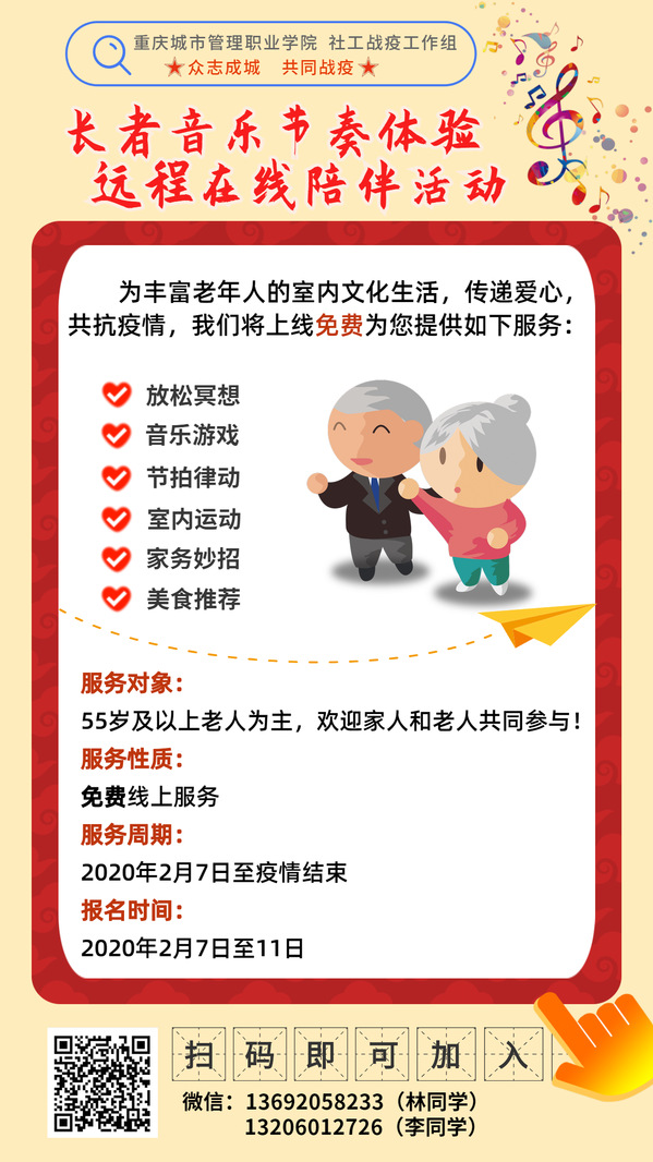 “加油站”让老人生活更健康。为了丰富老年人在居家抗疫期的室内文化生活,协助长者朋友们维持健康体魄、愉悦心情、共抗疫情,加油站的师生们一起发起了《共克疫情,护爱长者》公益服务活动。经过短短的两天紧张的筹备,在加油站4名社工专业老师指导下,2月7日,护爱长者网络服务正式上线了。护爱长者服务团队招募了志愿者20余人,其中包括4名在校学习的南非留学生。仅仅一天时间,就有70余位老年朋友通过微信平台加入到本次活动中。志愿者们通过录制音乐律动视频,带领老年朋友一起采取打卡参与的方式,邀请老年朋友健康运动,维持生理健康。在校学习的南非志愿者们还为老年朋友们录制了音乐节奏健身操。同时,志愿者们通过开通咨询热线及线上沟通服务,协助中老年人保持社会交往和心理情绪疏导,避免社会隔离风险,缓解情绪困扰。