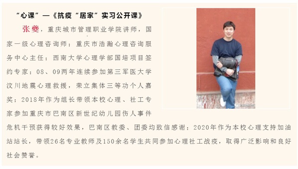 2020年新春伊始,在新冠肺炎疫情防控的特殊时期,为贯彻落实习近平总书记关于防控新冠肺炎疫情的重要指示精神和党中央、国务院决策部署,响应“停课不停学”号召,我校组建师生团队积极构建模块化专业课程体系,制作了《抗疫居家实习公开课》,被社会工作“心课”联盟挂网面向社会开放。