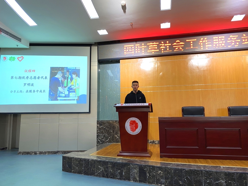紧接着第七期优秀志愿者罗明波分享了在校期间志愿服务故事,从大一羞涩得自我介绍紧张发抖到慢慢主动与他人沟通到竞选志愿服务队队长,通过参与志愿服务得到很大的蜕变成长。专职社工蔡林利对《重庆城市管理职业学院四叶草社工站志愿者管理办法》以及志愿服务系统注册步骤进行讲解。