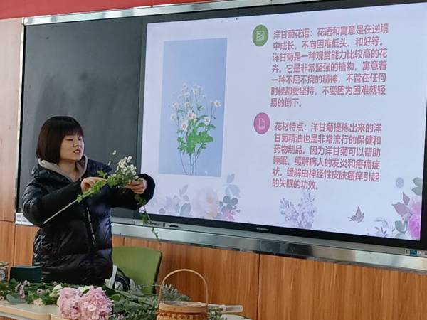活动开始前,余长惠老师生动形象地对本次活动所用到的花做了详细介绍。她谈到每一种花代表着不同的含义,比如粉色绣球的花语是浪漫与幸福,洋甘菊的花语是不屈不挠,逆境中成长。正如同学们一般,要做个纯洁无邪的人,在逆境中学会坚毅不屈,才能走向成功。