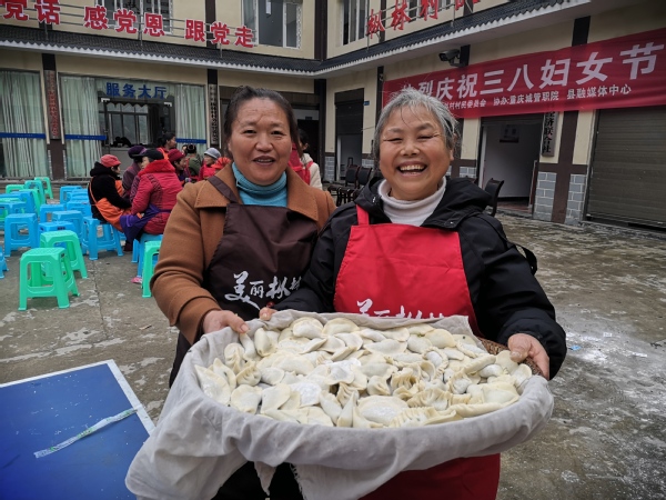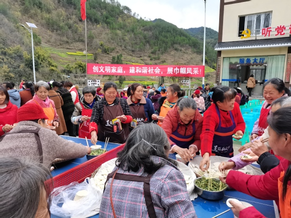 活动最后,美丽的枞林妇女自发开始包饺子,大家各显身手,分工协作。一簸箕形态各异的饺子整齐摆放在筲箕和盘子里,饺子在两口大锅里翻滚,溢出淡淡的清香,吃着自己包的饺子,聊着村里的变化,脸上露出了幸福的笑容。一位年过八旬的婆婆说:“村里几十年都没有搞过这么热闹的活动,是第一次给我们农村妇女集体过节,这要感谢党、感谢政府,是党和政府让我们过上了一个难忘的节日”。