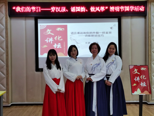 活动在重庆城市管理职业学院天一国学协会优雅的传统翩翩袖舞中拉开帷幕。首先,我支部支部书记、文化与旅游学院党总支宣传委员杨洁副教授根据小朋友的学习特点,将《文化讲坛》搬进了活动现场,声情并茂地讲解我国清明节习俗以及诗词朗读技巧。清明节兼具自然与人文两大内涵,既是自然节气点,也是我国四大传统节日之一,清明节主要习俗有扫墓、踏青、植树、插柳、荡秋千、蹴鞠、放风筝、吃青团等。杨洁书记还讲到语言表达与人的外貌一样重要,在诵读古人诗词的时候,应使用科学的发声技巧,打开口腔提颧肌、打牙关、挺软腭、松下巴,准确理解诗词含义,在诵读情境中领会古诗词魅力。