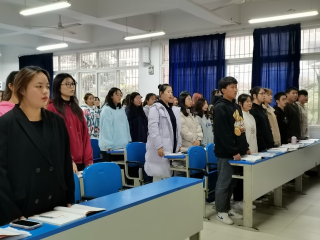 伴随着入场歌曲《歌唱祖国》,同学们纷纷走进教室情不自禁集体跟唱起来。开班仪式上,喻浩同志首先介绍支部入党启蒙培训班安排及培训纪律,接着全体起立奏唱国歌。开班仪式后,本次培训的主讲人杨洁同志为大家做了题为《追昔抚今,换了人间》的报告。