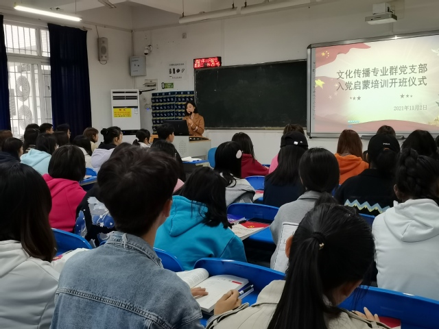 11月2日下午,文化传播专业群党支部第1期入党启蒙培训班在敏学楼D104正式开班。开班仪式由文化与旅游学院党总支专职组织员、支部组织委员喻浩同志主持,培训班第一讲由支部书记杨洁同志主讲。