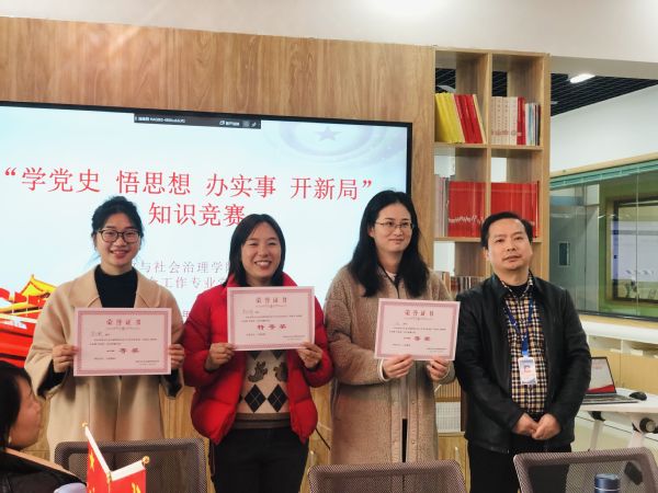 四史知识竞赛活动应用数据统计、采取手机扫码答题的方式,在题库中随机抽取55道题目答题。同志们参与积极,严格按照竞赛规则展开活动。活动中曾树群老师荣获特等奖,王茜、李燕、蔡林利三位老师获一等奖,何静等6位老师获二等奖,刘炯等10位老师获三等奖。社会工作专业党支部书记李飞虎、组织委员曾树群为获奖老师颁发了获奖证书。