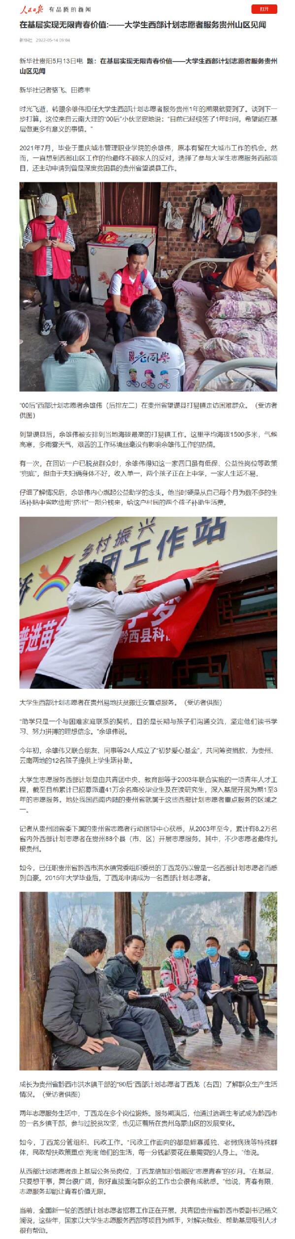 人民日报报道我院毕业生余雄伟:在基层实现无限青春价值——大学生西部计划志愿者服务贵州山区见闻
