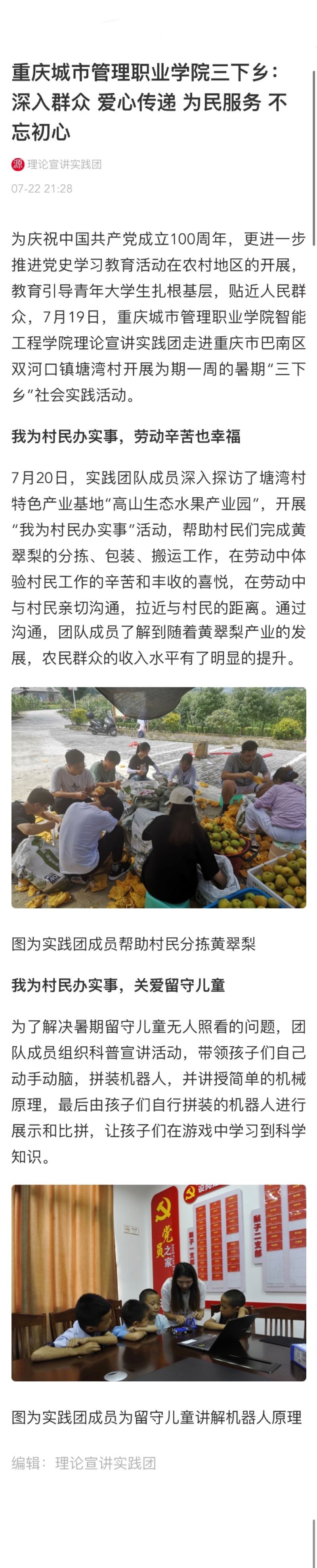 [上游新闻]重庆城市管理职业学院三下乡:深入群众 爱心传递 为民服务 不忘初心
