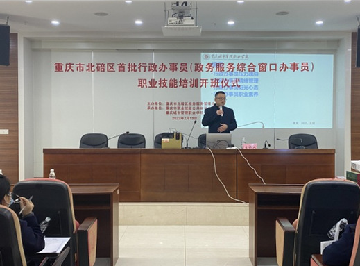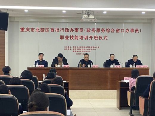 2月19日,由重庆市北碚区政务服务中心主办,我校和重庆市职业技能公共实训中心共同承办的北碚区行政办事员职业技能培训班开班仪式在北培区政务服务中心隆重举行,这是重庆市首批行政办事员职业技能培训。北碚区区委常委、常务副区长章榕,北培区副区长陈政,市人力社保局政策法规处处长胡京,北碚区政务服务办主任辛国民,重庆市职业技能公共实训中心主任张洪刚,我校继续教育学院院长陈娜、现代文秘专业带头人张东出席了开班仪式。北培区各街镇代表及59名窗口工作人员参加了本次培训。