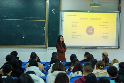 活动现场,首先由快手重庆创新发展中心内容创作及直播电商负责人吴秀琼老师,以通俗易懂的方式向同学们介绍了新媒体传播行业的发展前沿趋势,并以“校园短视频创作”为主题,围绕账号运营规划、视频内容产出、视频发布、数据分析、直播及高质量转化等方面做了精彩的讲解。