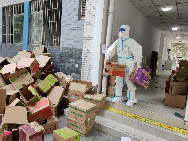 作为一名年轻女教师,在疫情面前,她一改女孩子的娇弱和精致,早晨起来第一件事不是梳妆打扮、整理内务、享用早餐,而是穿上防护服就投入到工作中去。送餐、送水、送药、送日常生活用品以及垃圾回收,成了她的日常。