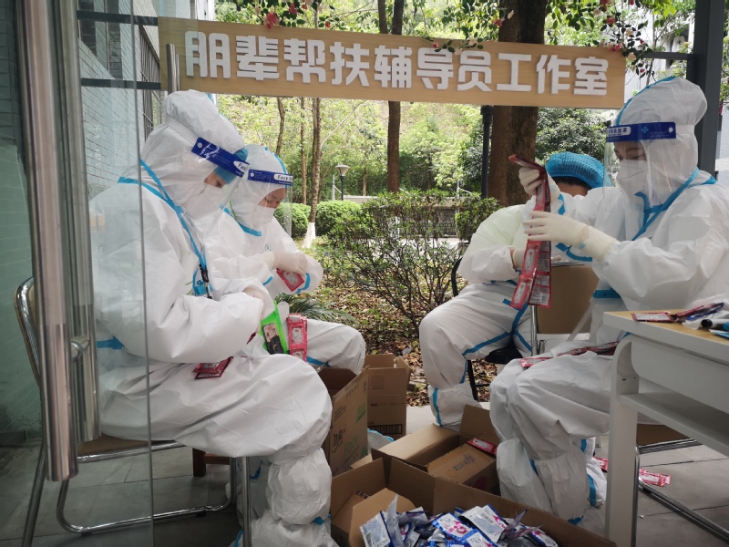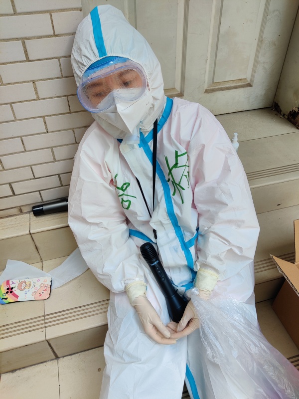 格格老师入住的秋实园三舍,一栋楼三百多个房间,八九百学生,学生们的一日三餐、用水以及日常生活用品,入住前两天全靠几名志愿者老师徒手提上去分发。在30度的高温下,穿着密闭的防护服,负重爬到五楼、六楼,一天往返十多次,往往一餐饭送完,她已经全身湿透,就连头发也没有一丁点儿是干的,双手被手套里滴落的汗水浸泡,一层层脱皮、肿胀。