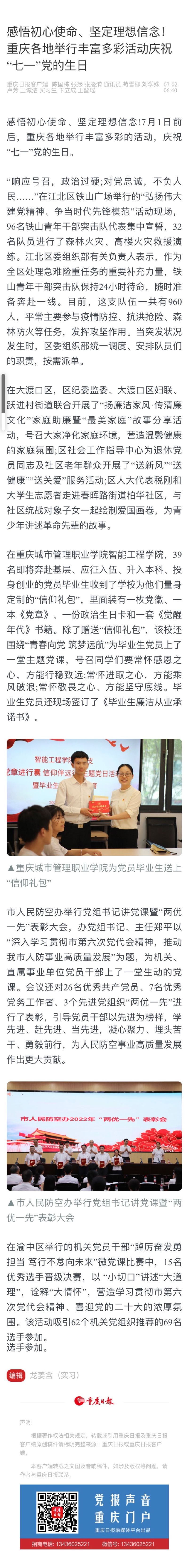 [重庆日报]感悟初心使命、坚定理想信念!重庆各地举行丰富多彩活动庆祝“七一”党的生日